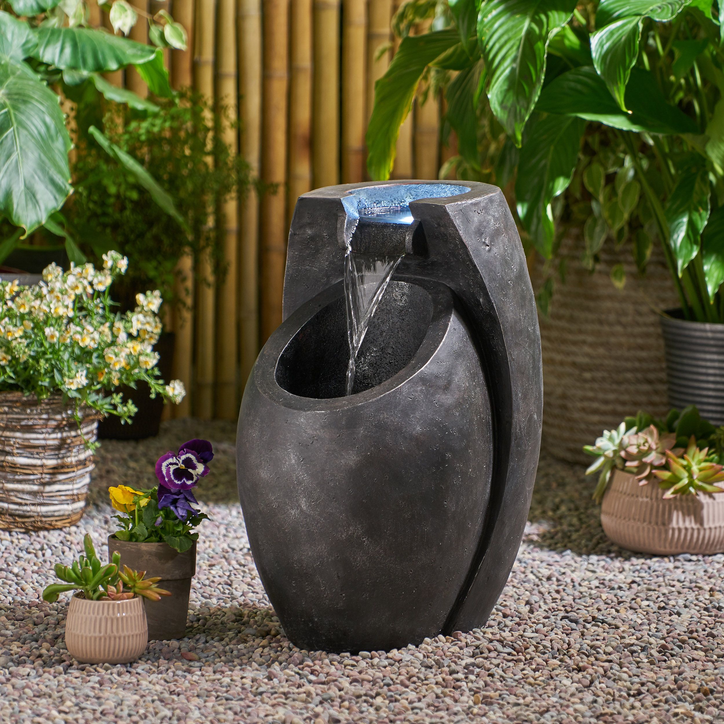 Experience your outdoor space to the fullest with stunning modern style and peaceful nature sounds. Our garden fountain features a calm waterfall flow that continuously circulates using an included pump, bringing a soothing aura to any backyard or patio. Crafted with an incredibly durable resin material, this decorative accessory offers a weather-resistant structure that allows outstanding attention to detail. Finished with an artistic abstract design and enchanting underwater lights, our water