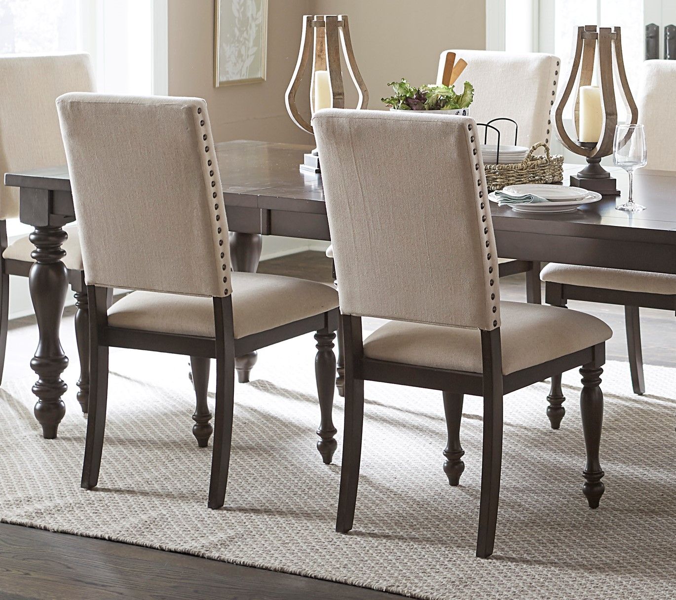 Casual transitional styling lends versatility to the placement of the Begonia Collection in a number of dining room settings. The grayish brown finish and traditional styling of the table and chairs lends distinctly to the execution of different looks from traditional to country casual. Neutral toned fabric chairs perch atop turned legs and feature nailhead accent that serves to define the chair backs profile.PRODUCT DIMENSIONS: -Table: 42" x 72" - 90" x 30.25"HApron to floor: 26"Distance between legs from the shorter side: 30.5"Distance between legs from the longer side: 78.5"Length of leaf: 18" x 1Side Chair: 20" x 25" x 40.5"HSeat Width: 20"Seat Depth: 18.5"Seat Height: 20"Listing Includes: - 7pc Dining Set ( Dining Table and 6 Side Chairs) Only.Simple Assembly Require.